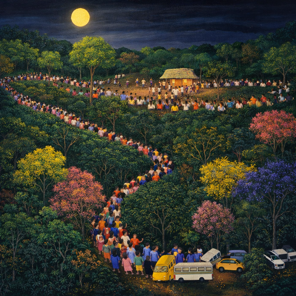 Na cena, vemos uma multidão caminhando em direção ao monte, guiada por um propósito comum: orar. Cada passo representa fé, cada pessoa simboliza uma história, uma necessidade, um clamor. O caminho iluminado pela lua revela que, mesmo em meio à escuridão, havia direção — porque quem sobe o monte não está sozinho, está sendo conduzido por Deus.