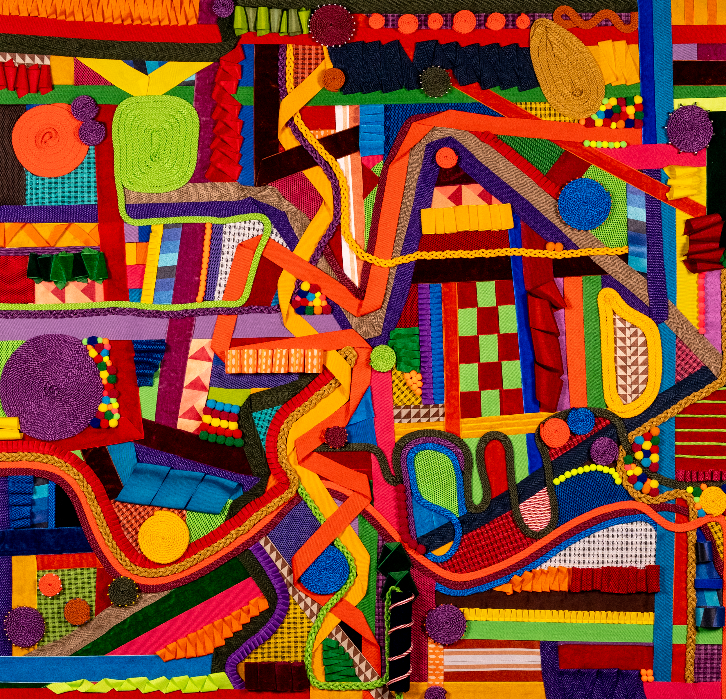 Técnica: Fitas de polipropileno tensionadas em duas camadas sendo a superior com curvas dando movimento a obra, e significado ao seu nome.